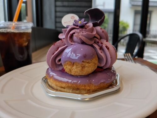 コロナの影響なのかイートインスペースが土日不可となっていたのでご無沙汰していましたが夏休みということで平日に久しぶりのアカシエです。夕方だとほぼ売り切れていますがこの日はまだ昼過ぎで選び放題だったので迷った挙げ句にサントノレを。デカいしク…