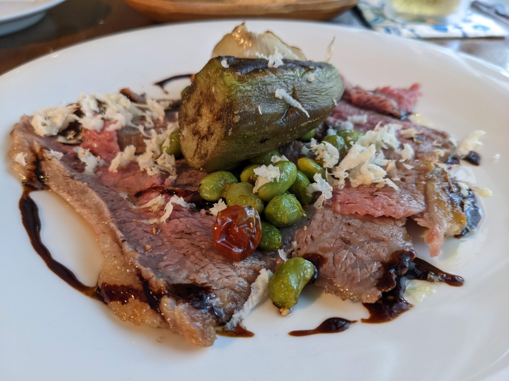 前菜は魚介類もりもりのサラダ添えです。事前オーダーで前菜をすっかり忘れてましたがいい感じにしてくれました。イワシのビネガー煮、タコ、ムール貝、サーモンなどがもりもりで、いつもどおり野菜ももりもりで、うまくてもりもり食べてしまいます。もりもり具合は過去イチかもしれん。真ん中にデカいズッキーニやナスが隠れてます。つーか何種類の野菜を使ってるんだろう。