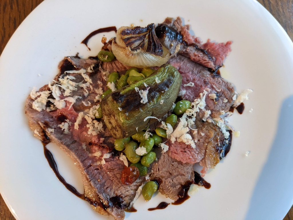 主菜はローストビーフにフレッシュマカを削ったものをかけたやつ。フレッシュマカは精力剤でおなじみのアレの生バージョンだとか。こんなふうに食えるとは知らんかった。ホースラディッシュのような風味で少しツンとくる感じがローストビーフに合います。うまい。肉系にはいつもマスタードを出してくれますがこの日はフレッシュマカだけでいただきました。ローストビーフは赤身肉大好きマンにはたまらんですね。