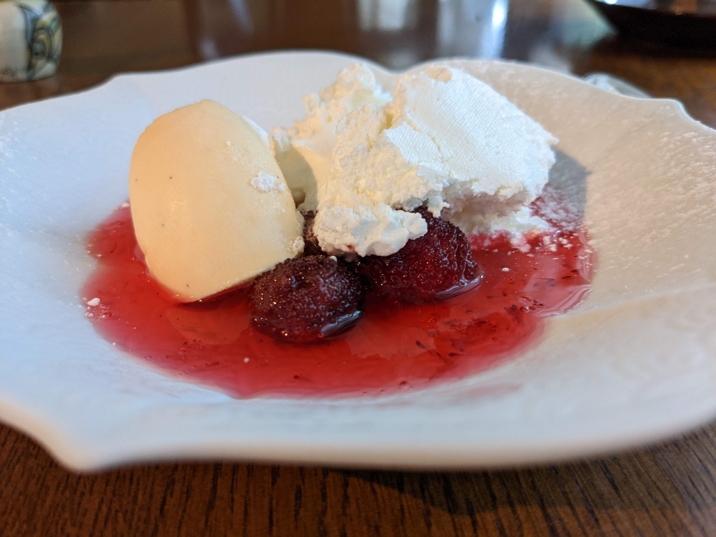 デザートはクレームダンジュな山モモシロップがけです。もりもり前菜で腹が限界だったので軽めに。シロップだけでなく山モモ丸ごとも添えてあり初めて食べました。種のまわりを薄く覆っている果肉を削り取るように食べました。わりと食べづらいのでジャムやシロップでよく見かける理由がわかりました。