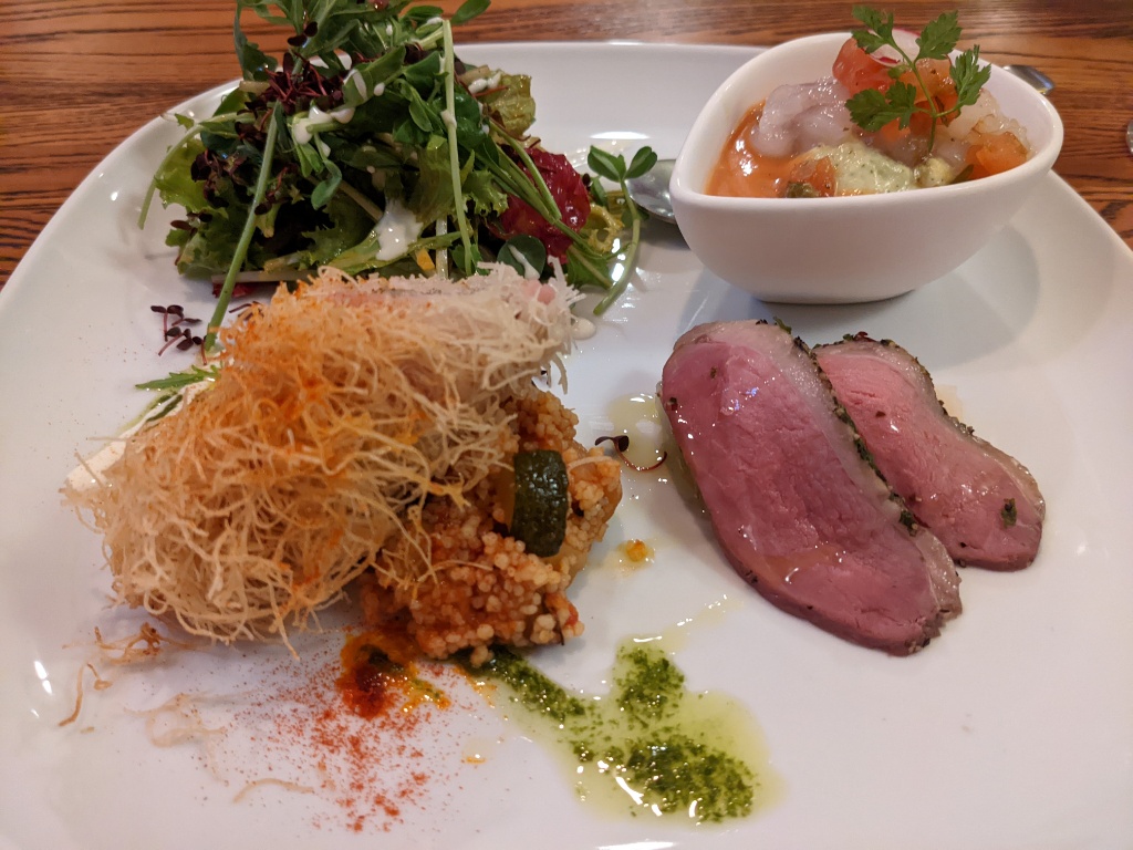 前菜です。説明を覚えきれなかった。右上から時計回りに、ガスパチョに何かのムース甘海老乗せ、合鴨のロースト、コロッケの中身みたいなやつのカダイフ巻きとクスクス、サラダです。どれも美味かったけど特にガスパチョとカダイフ巻きが好き。