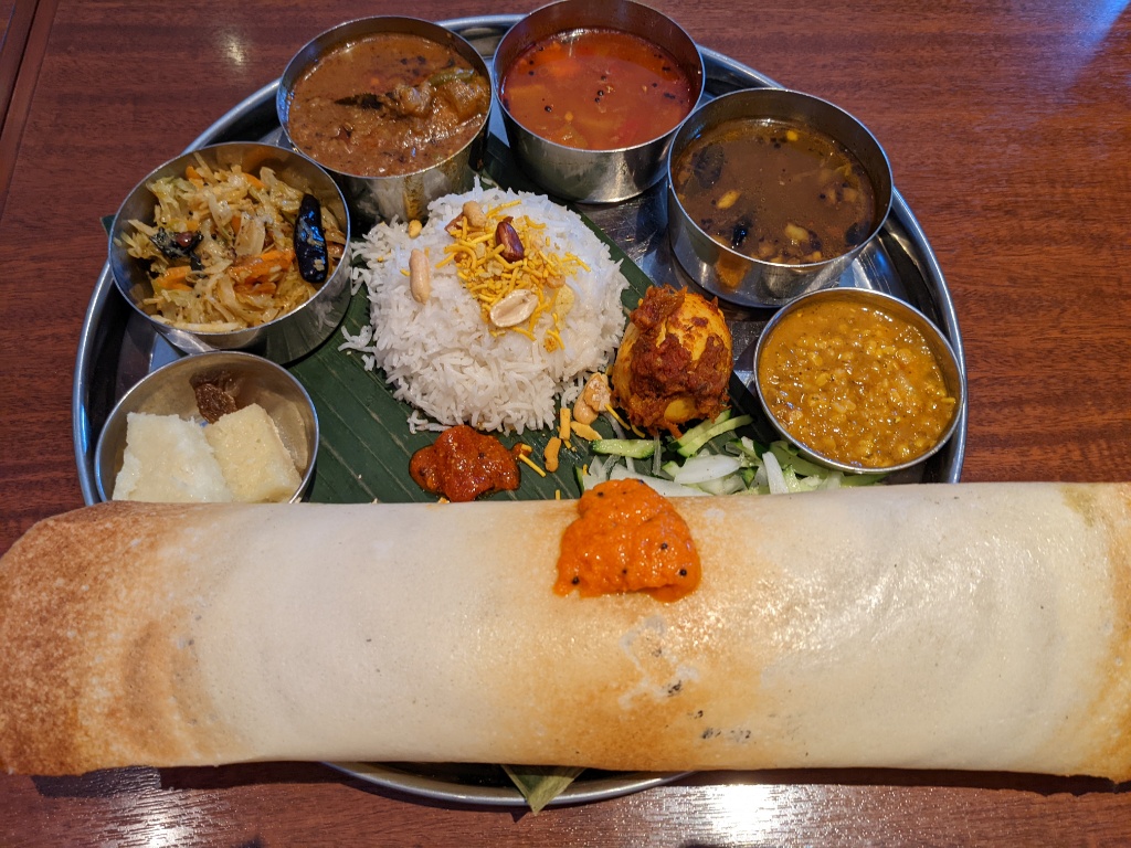 ノンベジミールスです。チェティナードチキン、ポリヤル、サンバル、ピクルス、ラッサム、バスマティライス、プレーンドーサ、パパド、サラダ、卵フライ、デザート、ソフトドリンクのセットです。ドーサはゴマナンかパラタに変更できるようです。初体験のドーサはまあこんなもんかなという印象。パラタ(ポロタ)のほうが好みだけどあっちはカロリーがやばそうなので適宜選択していきましょう。あと、この店はわからんけどドーサはたまごドーサとかキーマドーサとかバリエーションがあるらしいのでそういうのもチャレンジしてみたい。そういや今までにいろんな店でミールスを食べてきたけど初めてヒィヒィ言わずに食えた。辛さがかなりマイルドだったのでそういう人にオススメかも。(個人の感想)